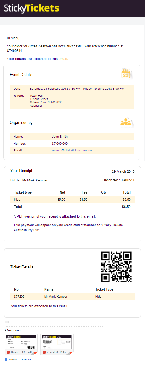 When a customer purchases a ticket to an event, Sticky Tickets sends them a confirmation email on your behalf. This email includes the purchaser's details and PDF attachments of the e-tickets and receipt. You can refer to the samples provided for a better understanding: