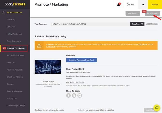 - Under the "Promote/Marketing" tab, click on the "Set Invitation" button.