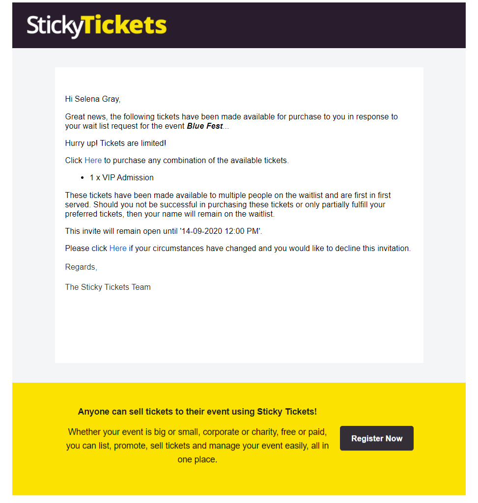 An email will be sent to the selected waitlist, informing them of the available tickets and the first-come, first-served nature of the invitation.